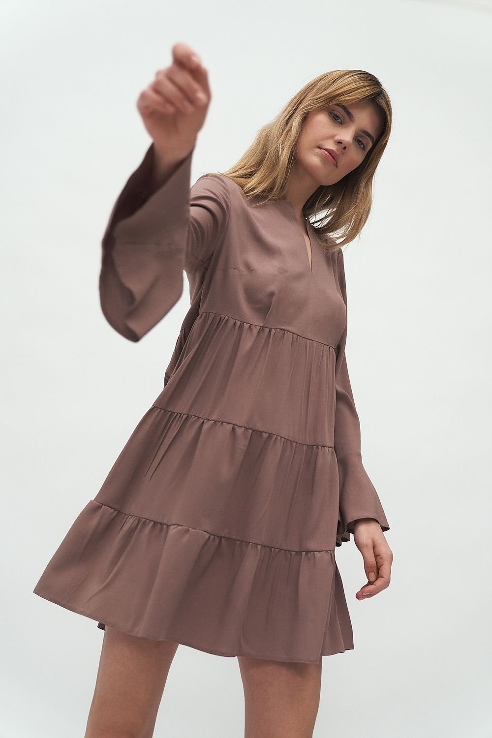 Dress with a frill is a very feminine model. The dress perfectly covers the stomach and hip area, and emphasizes the legs. A V neckline, pleats at frills, and flared sleeves combine to create a unique dress for women who appreciate casual elegance. The material from which it is sewn ensures comfort of wearing.