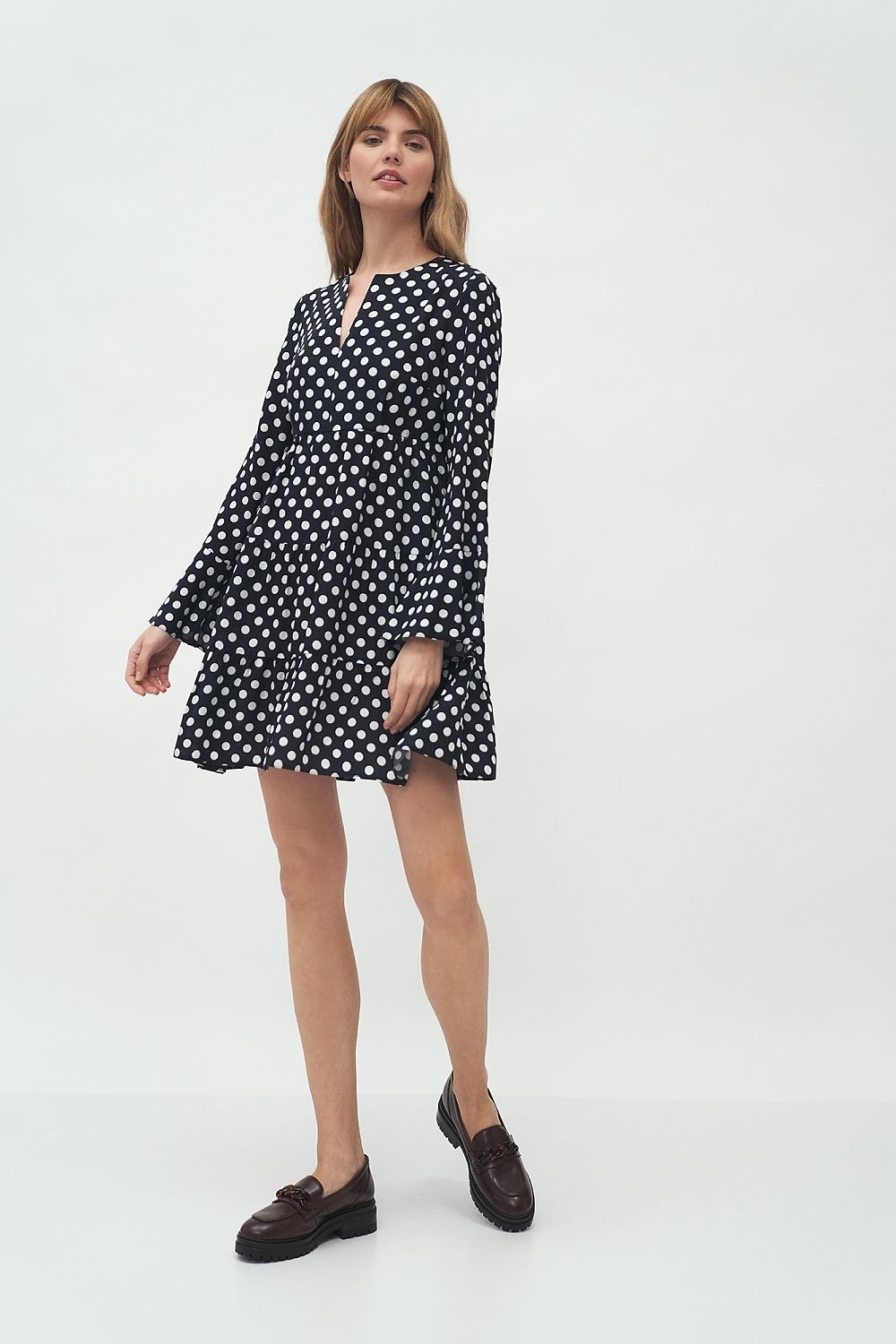 Dress with a frill will add charm to each of us! Extremely feminine model. Add to it a belt to emphasize the waist. Unusual sleeves and a girlish neckline give it character. Match it with a thick sweater and heavy boots and you're ready for a weekend outfit! The new composition of the material will let you feel comfortable all day long.
