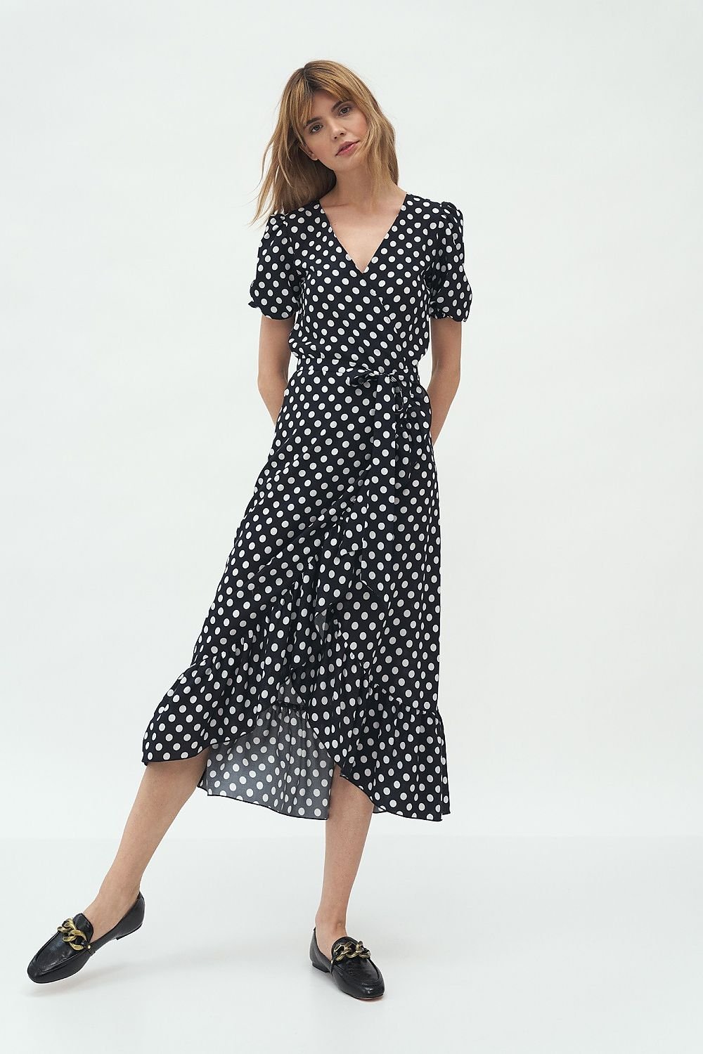 Charming boho style dress is perfect for everyday use with moccasins and sneakers. The frill trim and envelope neckline give it girlish charm.
